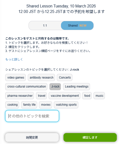 シェアーレッスンは、あなたの1:1レッスンユニットを1回分使用します。ゲスト側の1:1レッスンユニットは消費されません。