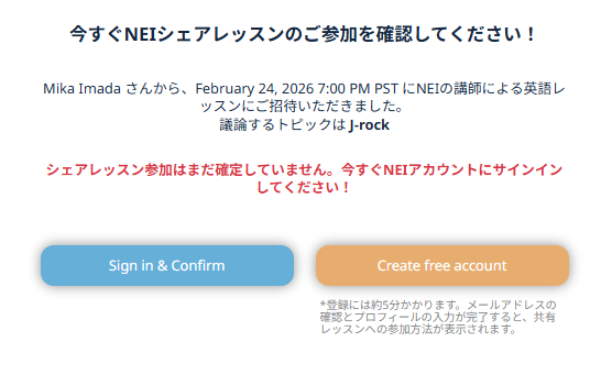 ぜひ!どなたでもシェアーレッスンに招待できます。ゲストがNEIのアカウントをお持ちでない場合は、アカウント作成の案内が届きます。登録は約5分で完了します。