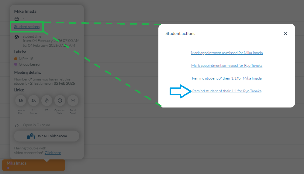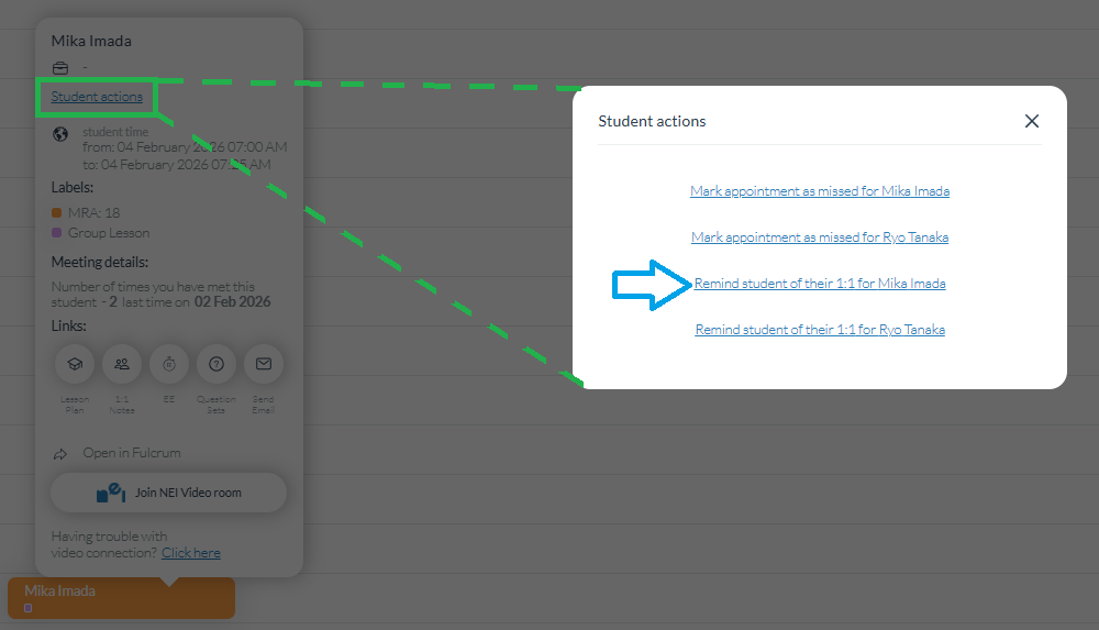 Sending an appointment reminder or marking a student as missed is done from the lesson block on your schedule, just as with a standard 1:1 lesson.