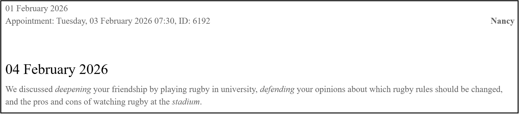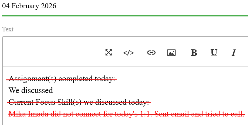 Your 1:1 Note should focus on the main points of interaction between the learners: shared experiences, arguments, collaborative ideas, etc.